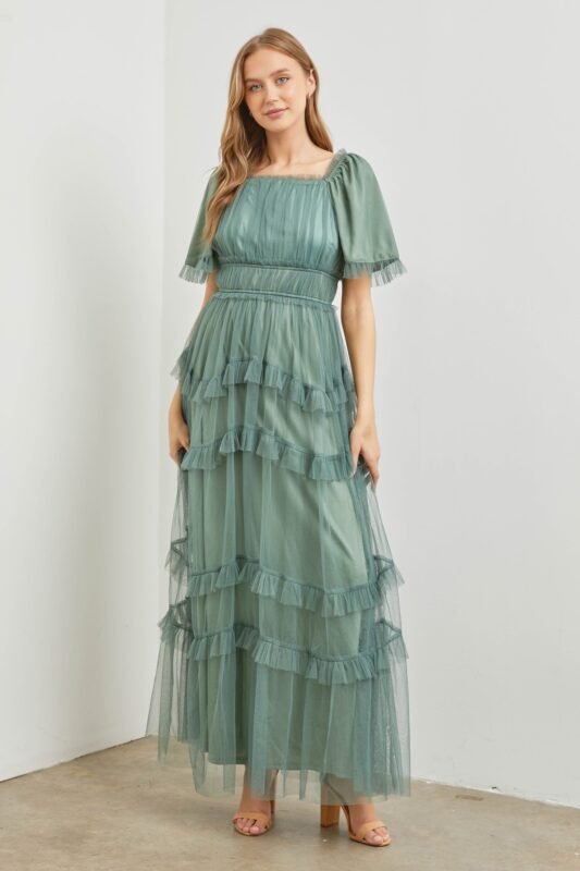 Polgram Tulle Maxi Dress in Dusty Teal