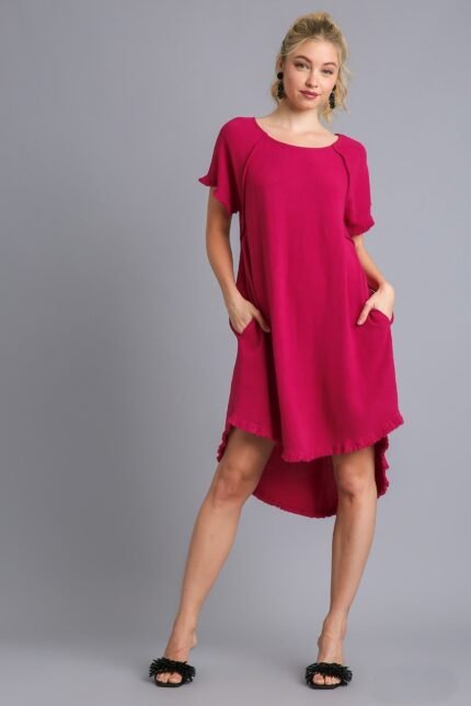 Umgee Ruby High Low Linen Blend Dress with Frayed Details