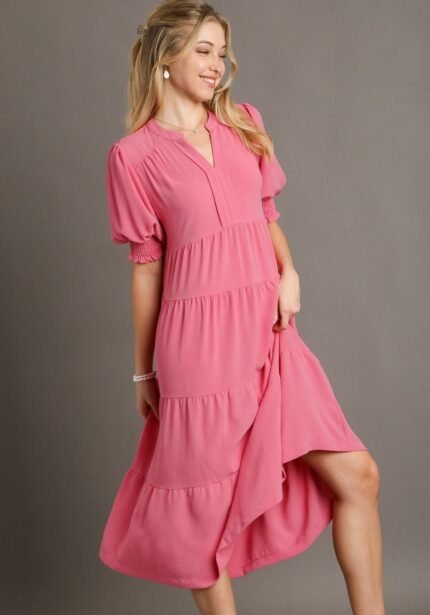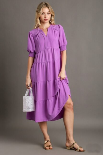 Details : Umgee Solid Color A- Line Tiered Midi Dress Split Neckline Short Balloon Sleeves with Smocked Cuffs Piping Details