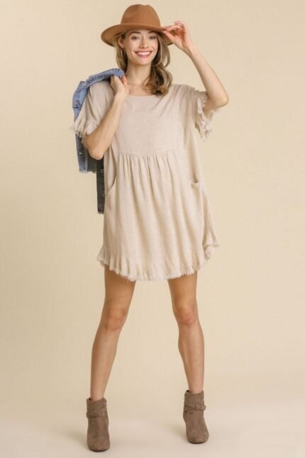 This Umgee dress is a lightweight linen blend, and it features short ruffled sleeves, a round neckline, pockets, and frayed